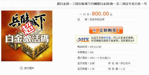 此时,在官方论坛惊爆一消息,“淘宝上有人在卖《兵临城下》超级白金码!800元!”。小编我似信非信打开网页搜索了下,搜到了一堆淘宝上叫卖《兵临城下》各种激活码的,在仔细的寻找下,果然,有一家店以八百元的高价售卖着这独一无二的超白金码。