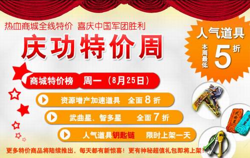 特价哦!真的是特价哦!不是特价一天,而是特价一周!不是特价一样的商品,而是特价几乎所有你能想到的商品!《热血三国》特价周,超级疯狂,超级折扣!而且七天不重样,每天都给你不一样的惊喜!8月25日—8月31日,从周一到周日,从内政生产到行军打仗,每一天都有我们的打折主题,每一天都有我们的优惠商品!超级特价周,疯狂大优惠,血拼族的福音,你还在犹豫什么?
