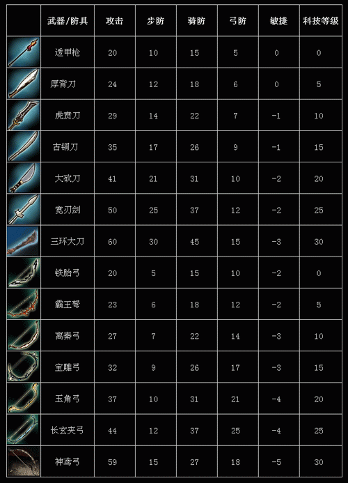 武器制造术:每升一级,可制造的刀、枪种类增加,制造刀、枪所需的资源数减少2%。