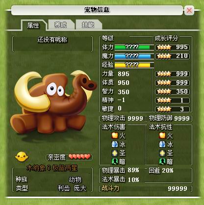 木纳象:体型被魔化,虽然不大,但是保持了祖先留下的强体与强力。特别技能,撒水逃跑。
