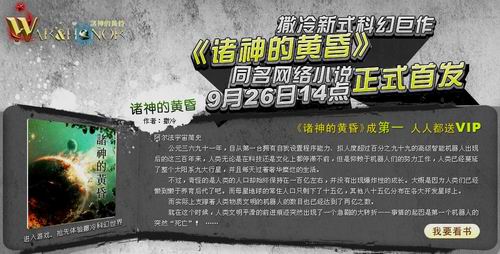 国内首款纯原创星际战略 网页游戏诸神的黄昏》的同名小说已经与今日(9月26日)14点正式发布了,作者是起点的著名作家撒冷。好不好看过才知道,欢迎广大文学爱好者去欣赏和评价:< http://www.qidian.com/Book/1063762.aspx>。
