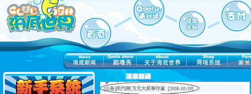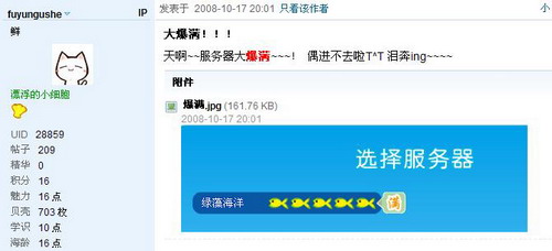 中国第一款网上乐园产品海底世界2008年10月17日12:00am开放不删档技术内测后,服务器开放后,玩家从全国各地大量涌入,到19:00pm左右就出现了服务器爆满,玩家无法进入的情况。