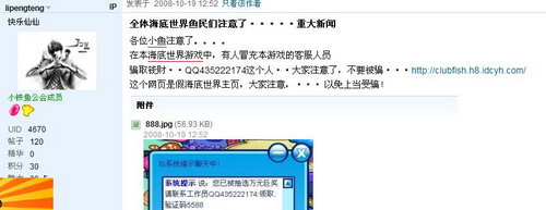 海底世界官方迅速采取行动,立即增开四个服务区才满足了用户的游玩需求。而技术内测进展到第二天,听说海底世界游客众多,几个专门在热门游戏中行骗的资深网游骗子就闻风而动,来到海底世界行骗,下图是海底世界玩家论坛对骗子的举报: