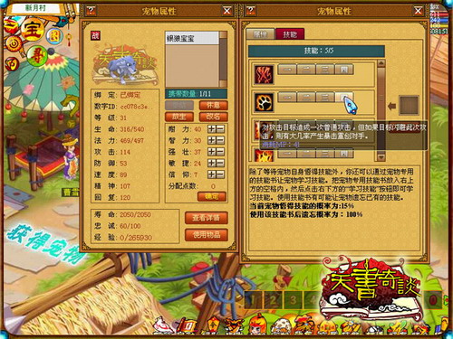 那么,如何让您最爱的宝宝拥有宠物技能呢?您一定想知道吧?体谅到您的迫切心情,现在就让《天书奇谈》告诉您吧,其实《天书奇谈》的宠物技能是靠宠物自己领悟的,就像是武侠小说里的大侠创出绝世武功那样,宠物学会一项技能完全由宠物自己领会。如果您想要获得一只会“喷火”技能的兔子或者一只会“撕咬敌人”的猫眯,只需要打开宠物培养面版,培养宠物悟性达到一定值的时候,你想拥有的宝宝独门绝技就出来拉!