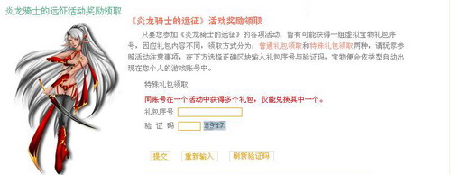 第五步、将获得的新手卡密码和随机的数字验证码,填在特殊礼包领取的版面中,然后点击提交,即可获得相应的奖励了。