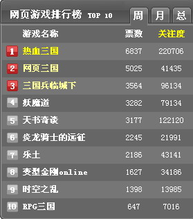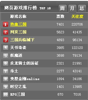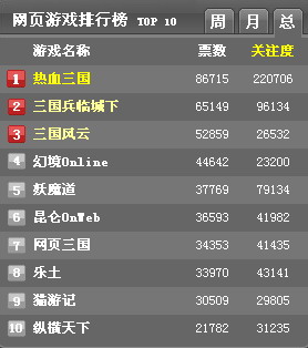 近期,年度人气网页游戏《热血三国》持续火爆,在连接突破了一百万,两百万,三百万注册用户大关之后,目前在17173网页游戏排行榜的游戏排行榜中以每周7000余票的强劲势头打败众多强手,跃居周,月,总三大排行榜首位,将其他竞争对手远远地抛在身后!自从《热血三国》第一次上榜之后,在17173网页游戏排行榜中排名便不断攀升,更成为了最受关注的战争策略型网页游戏.
