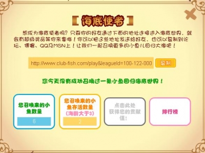 你可以通过QQ、MSN等来召唤朋友一起进入海底世界,小鱼们可以点击【排行榜】来比比看谁召唤的小鱼更多~那11月22日的活动就是海底的召唤,比比谁的贡献大~~
