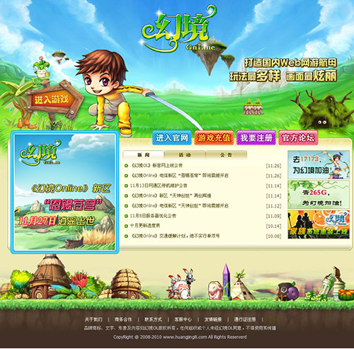 http://www.huanjing8.com/news/gf_news/200811/26-249.html 与此同时为迎接11月27日《幻境Online》的电信新区"恩赐苍穹",官方也于11月27日隆重推出全新风格的《幻境Online》官方网站。新的官方网站将更为美观,体现出梦幻般的风格。同时,官方也将根据玩家的资讯需求,在新版官网上为大家提供更详实丰富的游戏指南和讯息。