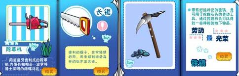太平洋城建设委员会紧急加运了一批劳动工具到珍珠礁的老龙虾货栈,劳动工具中有铁镐、长锯和除草机,小鱼们不仅可以在深海光缆挖石头,还可以到海葵森林锯海葵树,到水母牧场除草,有越来越多的地方可以让小鱼们劳动,真是太高兴了, 听说这些劳动工具本周五就要出现了,哦哦~~看看我拍下来的劳动工具吧~