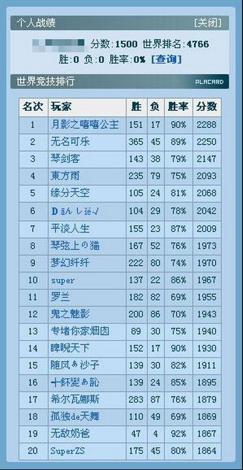 “竞技”是存在世界排名的,在聊天输入窗口上方有五个图标,点击一个“奖杯”样的图标后就可以查看竞技世界排名。竞技世界排名的内容如下图所示: