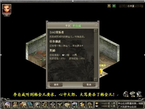 在《华山论剑》的剧情中,李自成是个落魄务农的西夏王室的后裔,不仅终日受地主盘剥压榨,甚至还因妻子韩金儿的不忠而买凶杀妻,最终背上人命官司迫不得已走上**之路。尽管游戏中这段剧情设计的颇为巧妙,玩家扮演的角色与李自成、韩金儿等的对话也非常诙谐、搞笑,然而还是有不少《华山论剑》的玩家表示对这段剧情是否是真实的历史提出了怀疑--大名鼎鼎的闯王李自成竟然重演了《水浒传》里宋江的家庭悲剧,而李自成**的初衷居然也是因怒杀不忠妻子才“逼上梁山”的?