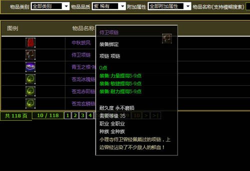 数据库采用JS技术开发,保证极高的搜索效率和准确度,支持模糊搜索。同时玩家只需要把鼠标放在装备名称上,即可查看装备的属性,无需在新窗口中打开,提高了物品的查询效率,减少了玩家的操作。同时数据库还将会进行后续开发,装备掉落,任务奖励等信息都会融合进来,届时功能会更加丰富。