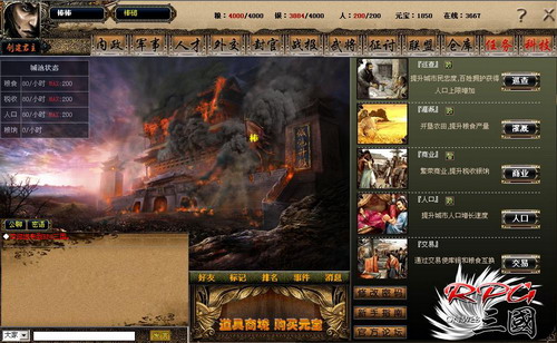 城池崩坏是目前已经开放的攻城系统的最后补完功能。目前攻城战只是计算城池守兵,当被攻击方城池守兵为0的时候,则判定城池被攻陷会被“打飞”(被系统随机分配到地图上的任意一块空地)。而城池崩坏系统加入后,将会加入城池防御度的判定,必须守兵和防御度都归0时,城池在被判定为攻陷,而且城池在被“打飞”的同时还会损失相应的发展等级。玩家在攻城时还可以携带不同等级的攻城车来快速的降低城防,让城战变的更加的紧张刺激。