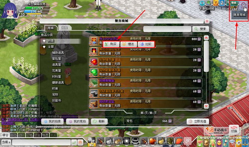 选择你想要购买的商品,点击左键会出现:购买、赠送、比较三个按钮,点击购买则出现数量选项购买商品,单击赠送则出现数量选择和获赠人姓名选项,比较按钮搜索商城中同类商品。