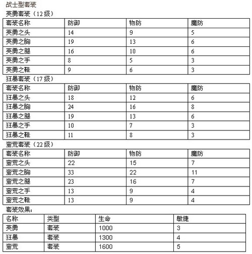 1.新增战士套装三套:英勇(12级)、狂暴(17级)、雷霆(22级)套装。