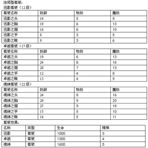 2.新增法师套装三套:迅影(12级)、卓越(17级)、魂铸(22级)套装。