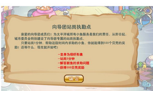 随着越来越多的小鱼来到太平洋城市观光,很多很多小鱼都希望得到向导的帮助,而很多海底的向导也都希望有一个统一的平台来帮助小鱼,发明家波罗多博士特别发明了海底站岗执勤点让海底的小鱼来站岗,透露一个秘密~~这个站岗执勤点不仅在鱼民之家有,而且在移民办公室,深海镇,珍珠礁都有哦,站岗一次5分钟你会得到太平洋城500贝壳奖励!不过一条小鱼每天只能工作一次!