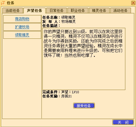 每位牧场居民只要声望达到10级,都可以在声望任务中领取一只精灵。看到10级声望任务大家也不用忧心,只要你按照任务路线稳步发展,半天之内就可以达到声望10级了。