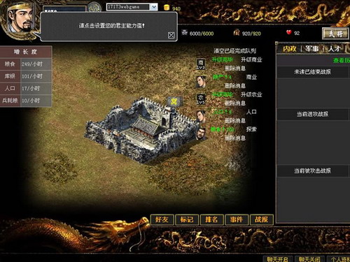 与上面的“盖房子”流模式相比,相似之处就在于还是君主扮演模式,玩家一进游戏就是拥有自己城池的君主;最大的差异就在于取消了建造房子这套流程模式,而是改为类似三国志九那样的操作指令模式,执行一个操作指令持续一段时间得到工作结果。不但模式是仿三国志9的,就连指令的名字也几乎完全照搬三国志9,就更别说图片了。