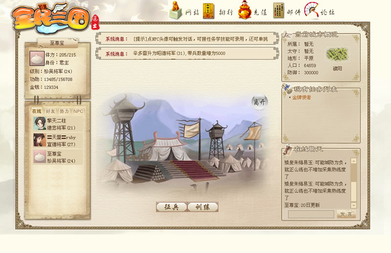 《全民三国》的城战系统是截止目前为止,唯一一款完全抛弃了“一人多城”君主扮演模式,取代为“一城多人”武将扮演模式的三国题材WEBGAME。玩家不再是一上来就是有城有将的君主,而是需要从默默无名的普通武将,通过打怪、练级、采集、生产等RPG流程来培养自己,最终和其他玩家一起组成势力攻城掠地,打出属于自己的一片江山!堪称2009年网页游戏一大“牛”作。