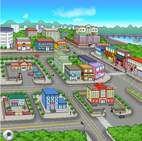 主要建筑包括:镇政府、猪猪储蓄所、卫生所、希望小学、废品收购站、小吃街、玩具店、7-Eleven、短途客运站、领奖中心