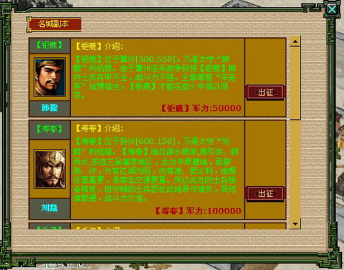 玩家除了可以扫荡暴民,五斗米道,黄巾军外,还可以参与到三国的历史事件中去。在你可以独霸一方后,名声四起之后,你可以派遣你的军队去攻占那些传说中的名城,攻占名城后将有诸多的好处,当然名城中那些三国人物的守将也是非同小可,可要先掂量掂量自己的实力再做打算。