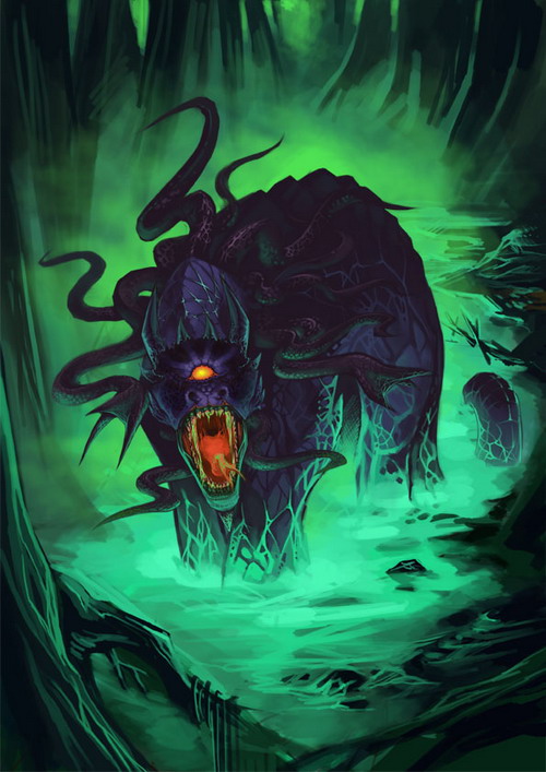 卡夫夏龙,蛇一样活动自如的脖子上盖满了漆黑的长须,鳄鱼一样的长嘴里长着尖利的牙齿。口中可以吐出熊熊火焰。四肢粗短有力。尾巴细长。长有一只眼睛。