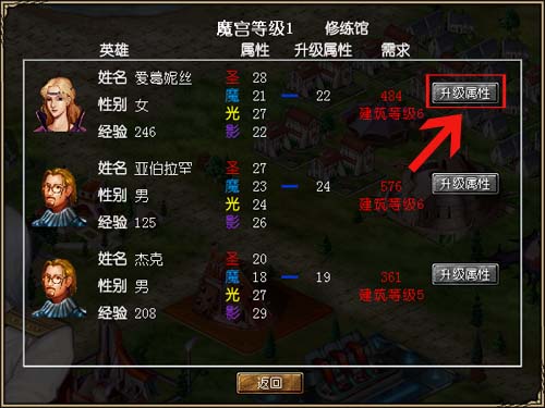 在魔宫中可以升级英雄的魔属性。(魔宫必须达到一定等级,英雄也需要拥有一定经验才能进行升级)