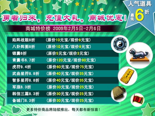 活动期间,在【U9】热血三国每天都能享有商城优惠促销活动!在4日的第一批促销活动结束后,今天,掌柜又将给广大玩家带来什么样的商品,又会是什么样的优惠价呢?!赶紧来看看,从6折到9.4折,请注意!是6折哦!你没有看错,每样都是物超所值!还等什么?机不可失时不再来,赶紧行动吧!