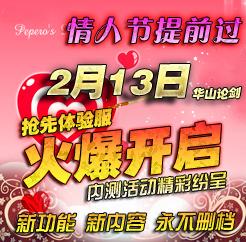 情人佳节手牵手,《华山论剑》游一游。至此浪漫佳节之际,09年武侠巨着《华山论剑》亦传喜讯,“华山”宣布2月18日正式开启不删档内侧,玩家们终于可以免除一切后顾之忧,从此专心修炼,畅游武林了。为了使玩家们能够尽早体验到不删档内侧的魅力,《华山论剑》今日(13日)14:00点率先举行“VIP服”的首映庆典,玩家们可抢注VIP限量体验版,最终体验者将由陈巨侠随机选定。