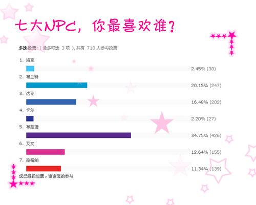 在持续至今的MM封测过程中,众多帅气又有个性的美眉追求者们——我们的七大美型NPC,早已成为广大玩家热切讨论的话题之一!大家用超赞的想象力,用无法抵挡的热情,用最最真挚的情感,在MM这个萌到无以复加的游戏世界里,与帅哥们展开了一段又一段或浪漫或搞笑,或深沉或温暖的恋爱!那么,在这七大NPC当中,究竟谁是最受欢迎的“人气王”、是得到最多玩家青睐最多的“第一男主角”呢?早前,MM官方论坛上的资深神秘人士“九霄环佩”,特别就玩家对NPC们的“有爱”程度,发起了一轮“旷日持久”的投票,而参与投票的玩家,高达七百余人!