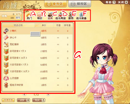 这就是商城六大道具区啦!点击ABCDEF六个图标,C区当中就会显示与以上六个图标相应的道具商品了。