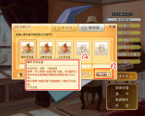 买东西嘛,当然希望在最需要的时候,马上就能够买到手!所以MM商城系统还为大家提供了“快速购买”通道!比如说,当你的美眉在上一节超长的大课时,你可以通过“加速日程”按钮,弹出“快速购买”界面,选择相应的时间加速道具,然后点击“快速使用”按钮,缩短美眉的日程,让她快快长大!