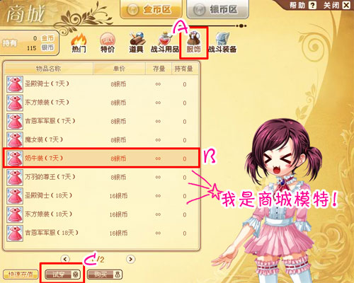 下面让我们来看看试穿功能的操作方法吧!进入商城后,点选“服饰”图标(A),显示服饰列表,从中选取自己想要试穿的衣服(B),再点击“试穿”按钮(C),好啦!模特美眉大变身,迅速穿好新衣服,等你欣赏!
