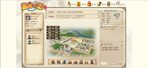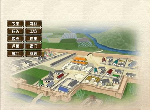 1、工作界面:玩家进入任意一座城市,在页面中间显示的就是可以进行的各工作选项,其中包括农田(可以种地获得棉花、粮食)、码头(造船)、客栈(住宿以回复体力)、兵营(征兵、训练)、城门(出城)、森林(伐木获得木头、打猎获得狼皮和虎皮)、工坊(木工制作***、缝纫生产布甲、铸造生产**铠甲)、市集(购买出售物资、玩家间交易)、衙门(移居)、桃园(势力添加与管理),其中部分生产工作可以在一定时间内获得相应的经验。