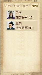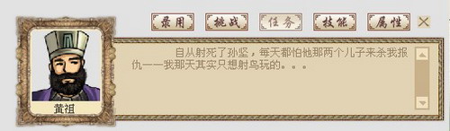 2、其他玩家与NPC:在主界面的左下部分,有如下图选项框,点击NPC选项会显示出当前所在城市内的NPC人物(图3),再左键点击黄祖头像,出现(图4)对话框!玩家可以对次武将进行录用、挑战、接受任务、技能、属性查看等操作。