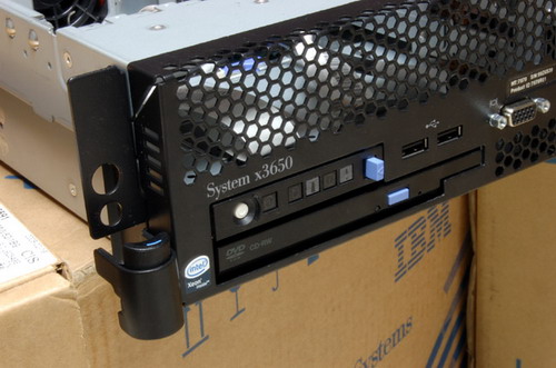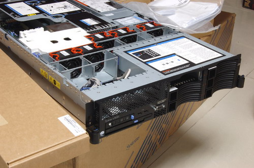 本次上海新服这组服务器将由三台核心服务器组成,他们都是采购自IBM,其中进行网页文件存放和数据库计算的是两台IBM X3650服务器,它们都配备了两颗目前最快的四核英特尔至强X5470(3.33GHZ)处理器,总共8核心,内存采用32G的FB全缓冲DIMM内存,4块15000转的73G SAS硬盘组成RAID5阵列作为存储设备,确保游戏数据库的高效稳定运行,使玩家日后不会因为服务器运算能力差出现卡的问题。