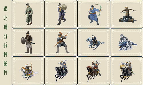 漠北阵营兵种:探马、牧民、匈奴步兵、草原枪兵、草原长弓手、兽兵、神射手、匈奴轻骑、匈奴铁骑、黑骑兵、木兽、千夫长、甲骑具装、粮草兵、辎重车、木牛流马、抛石器、车弩