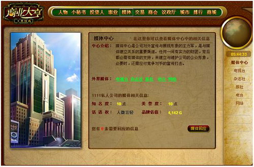 3、一个角色每天最多和每个媒体执行一次互动,点击进入媒体后可以进入到媒体详细页面,在详细页面玩家可以看到媒体的介绍,所属类别,友好度、媒体影响力、费用