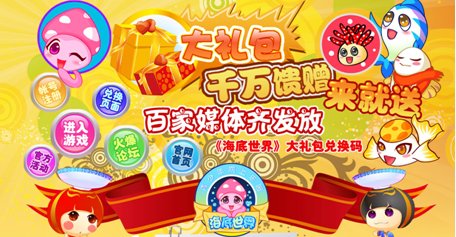 海底世界将从09年4月1日起,携手100家网络媒体,8家青少年纸媒体,3家海洋管,2家运营商共同推出“千万馈赠活动”,千万馈赠活动将送出价值100元的新手大礼包20万个以上,而每一个新手礼包将包含会员费月卡一张、稀有尊贵造型一组、可爱宠物一组、复式豪华别墅一幢等系列礼物。