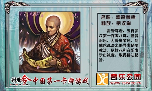 雷音尊者,五百罗汉第一百零八尊,懂音识乐,为普度黎民,到佛陀说法之处寻求秘要教法,以鲜花和音乐表示出诚意,取得佛法秘旨。神魔令现身之前,雷音尊者于如来佛国说法济生。听说神魔令现世,无辜百姓受到牵连,雷音去到佛陀处,希望听取法教,解救黎民。忽然,人界的天空有鲜花如雨般飘下,空中奏起美妙的音乐,雷音尊者从天而降。