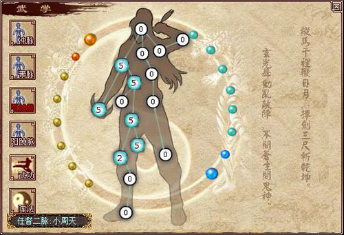 以经络为核心的武学系统,现今的大部分游戏除了招式名称的改变之外,几乎和那些西方魔幻中的魔法、战斗技能没有区别,经络武学系统则是从中国武侠文化中提炼出来的武学精华,逐穴打通经脉的设定不仅体现了中国武侠循序渐进、底蕴深厚的特点,还增加了游戏中人物发展、培养的多样性,更让整个游戏充斥着一种最纯粹的武侠中国风。