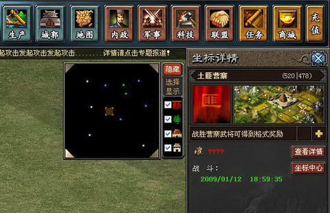 作为新引入的系统,目前《三国风云 PK》版的雷达可以显示玩家城镇周围的其他玩家城镇、绿洲、土匪营寨和历史名城的信息。