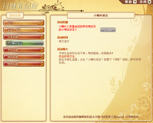 也许,有些玩家还不太清楚月城礼品店的具体用途吧?现在,我们就来再来简单为大家介绍一下吧!月城礼品店的首要功能是为了让大家更方便、更快捷、更没有风险地领取到各式各样的游戏奖励!日常奖励、活动奖励、节庆奖励,甚至充满神秘感的特殊奖励……,一份份令人意想不到的礼物、奖品,各种各样的出乎意料的惊喜,尽在这个神奇的礼品店当中!