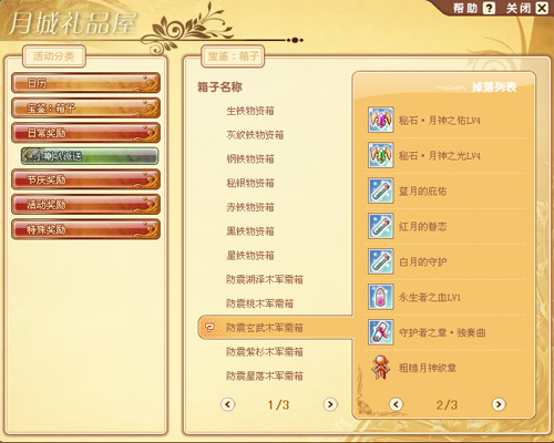 此外,月城礼品店还有一个重要的功能,那就是——箱子宝鉴!什么是“箱子宝鉴”?在即将到来的MM纯情内测当中,各种各样满载丰厚道具、物品的箱子将横空出世,每个玩家都将有可能从箱子中开出神奇的宝贝!当然,不同的箱子,其中所藏着的珍宝可是各不相同哦!那么,每种箱子将可能开出怎样的宝贝呢?啦啦啦!~~这就要看“箱子宝鉴”啦!礼品店当中的“宝鉴-箱子”界面中,就是各个箱子当中所能开出的物品、道具列表咯!