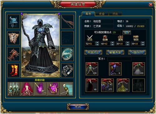 从这个全新的人物装备界面大家不必多想都已经能够感受到浓重的英雄无敌遗风,而装备栏中的人物造型赫然是内测中即将登场的亡灵族英雄的造型——身着华丽铭文的亡灵巫师。从图中右下角大家也一定看到了熟悉的兵种单位——骷髅兵、僵尸、幽灵、吸血鬼伯爵、幽灵龙。是不是感觉很棒呢?