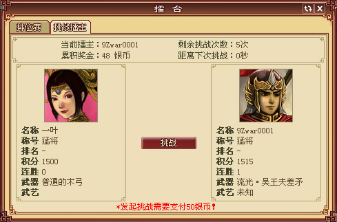 你要战,我便战!春秋好汉岂能畏惧擂台挑战,遑论闯天下的男儿们都有不打不相识的豪情。胜与负的瞬间感受久违的感动,血与火的间隙体验战斗的激情,擂台竞技只为英雄豪杰准备,在切磋交流、争勇斗狠中血水交融,或可以冲冠一怒气冠三军,将个性、风格发扬得无比充分;或可以挥洒义气,结交好友,为在九洲春秋争夺霸主席位建立庞大的友军集团。以战火慰平生,豪情男儿只为尽情一战!