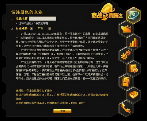 作为史上首款盈利式创业网页游戏,玩家在《商战飞黄腾达》中将扮演一个大企业的BOSS,在接手公司之后展开一系列商业手段,在商场上和其他的竞争对手抢夺市场。玩家在游戏中可以通过各种手段击溃竞争对手,抢夺他们的资金、人脉,最终将所有精兵强将收入囊中,成为游戏内最强大的集团企业,一展自己的商业智慧。除了发展企业打击对手以外,玩家可以让总经理对某个区域进行游说,来随机获得资金、员工、人脉、士气等奖励,体验到瞬间发家致富、咸鱼翻身的超爽快感!