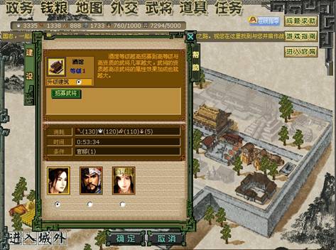 接下来你就可以在酒馆里招募属于自己的武将了。人才是你最重要的财产,麾下拥有强力的武将,可以使你事半功倍。武将在通过建设、征战过程中获得经验,等他到达一定的经验,武将的级别就会上升,每个武将上升一级将会获得一点属性点,你可以在武将的统御、勇武、智慧、**属性上加以分配。统御、勇武增加,如此下去,这个武将将会成为战场的中坚。如果一直增加武将的智慧和**,这个将领将会是治世良才,战争其实拼的就是物资、装备。因此治城的将领在发展霸业过程中,是不可或缺的。在后期,各位武将将会学会相应的武将技能,武将的技能可以在战斗中让部队坚守如山,冲击似火。真正体现“千军易得,一将难求”的境况。现实的三国,真实的世界,逍遥三国志让你身临其境!