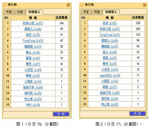 下图为桃源服务器3月12日15点12分和12日17时20分“玫瑰情人”排行榜截图。距12时活动开启仅仅3-5小时,我们可以看到排行榜上的玫瑰花数量是如何的火爆,又是怎样在短时间内发生翻天覆地的变化的。
